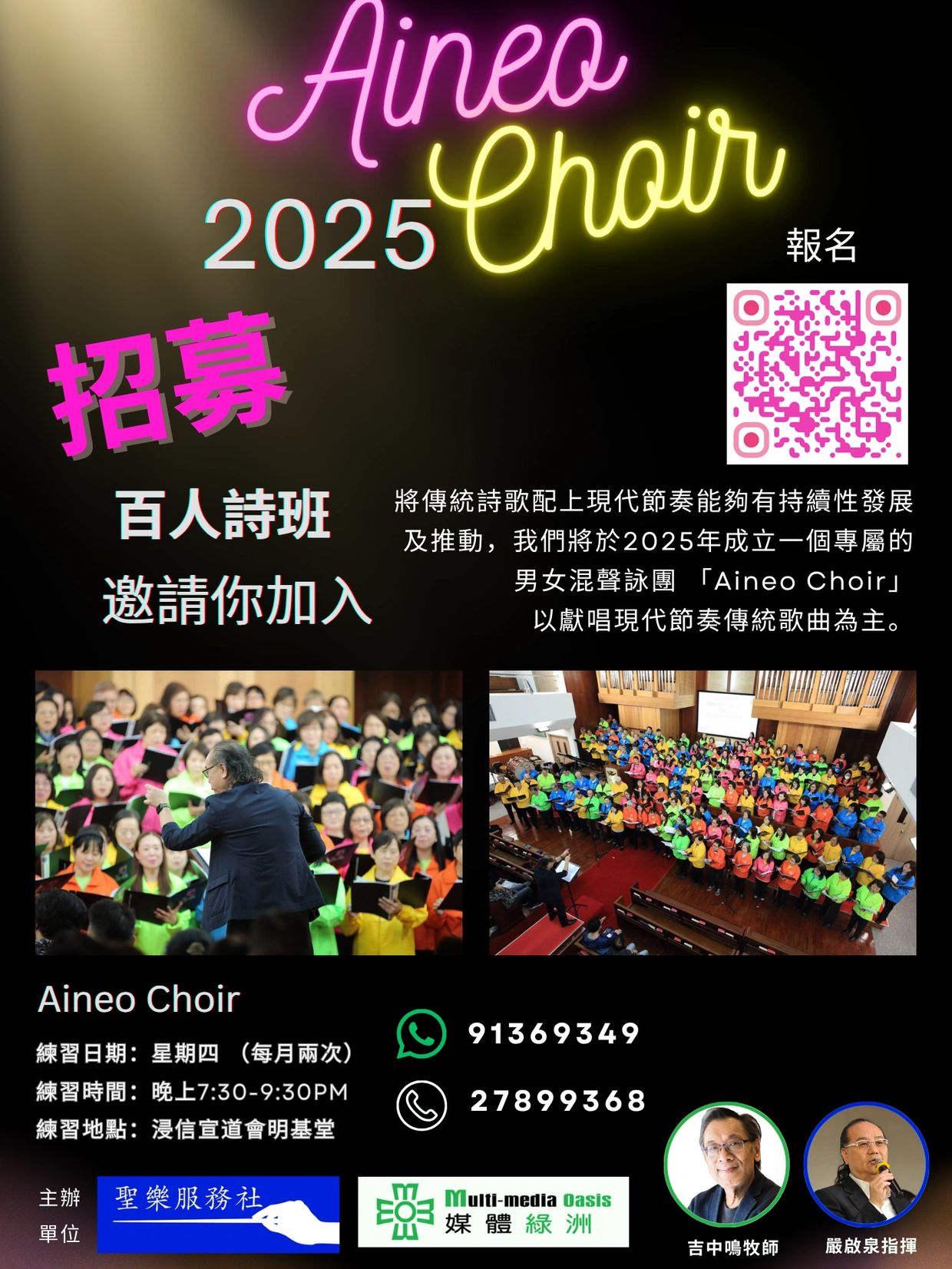 為了將「Aineo Live頌讚合唱」概念 - 將傳統詩歌配上現代節奏能夠有持續性發展及推動,我們於2025年第一季度成立一個專屬的男女混聲詠團 「Aineo Choir」以獻唱現代節奏傳統歌曲為主。