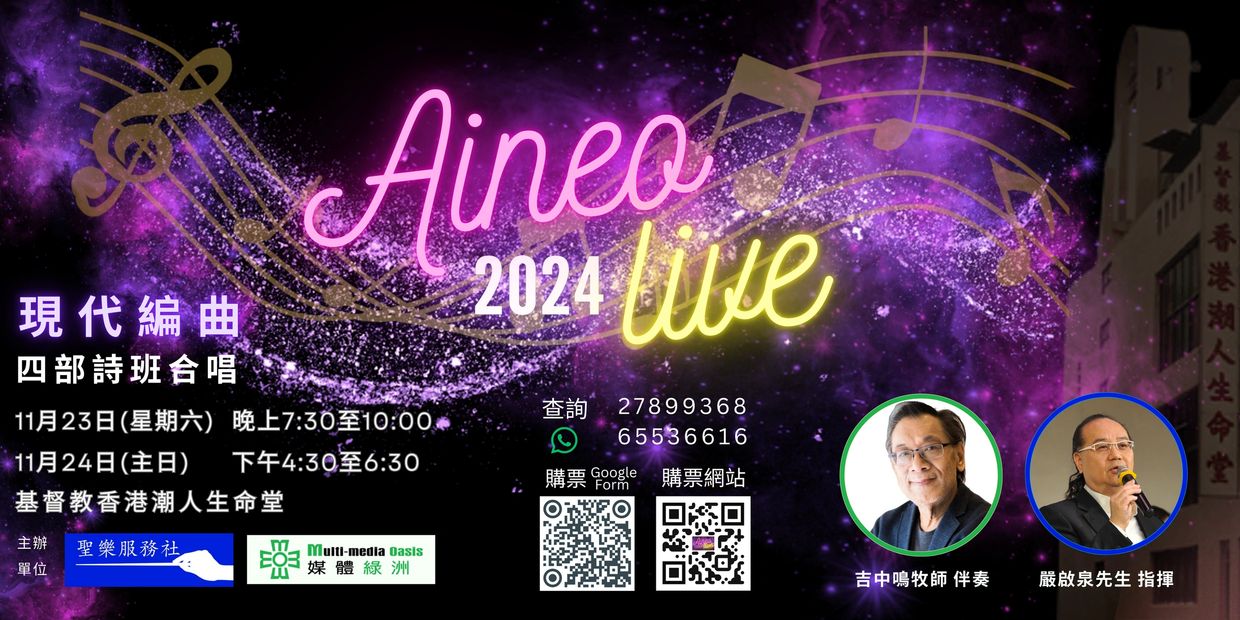 聖樂服務社及媒體綠洲都是致力以合唱牧養信徒及傳揚福音的教會音樂事工機構,兩機構將聯合舉辦 "Aineo Live頌讚合唱" 聚會,現誠邀各弟兄姊妹購票入場參與支持!詳情如下: